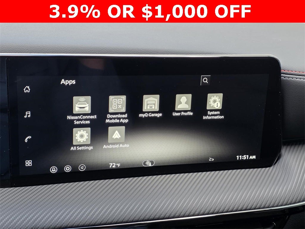 - Radio: AM/FM/SiriusXM Audio System -inc: 12.3" color touchscreen display w/6 speakers, Bluetooth® hands-free phone system, streaming audio via Bluetooth®, NissanConnect Services powered by SiriusXM featuring wireless Apple CarPlay, wireless Android Auto, Siri eyes free and hands-free text messaging assistant, audio and Bluetooth® steering wheel switches and Wi-Fi hotspot
