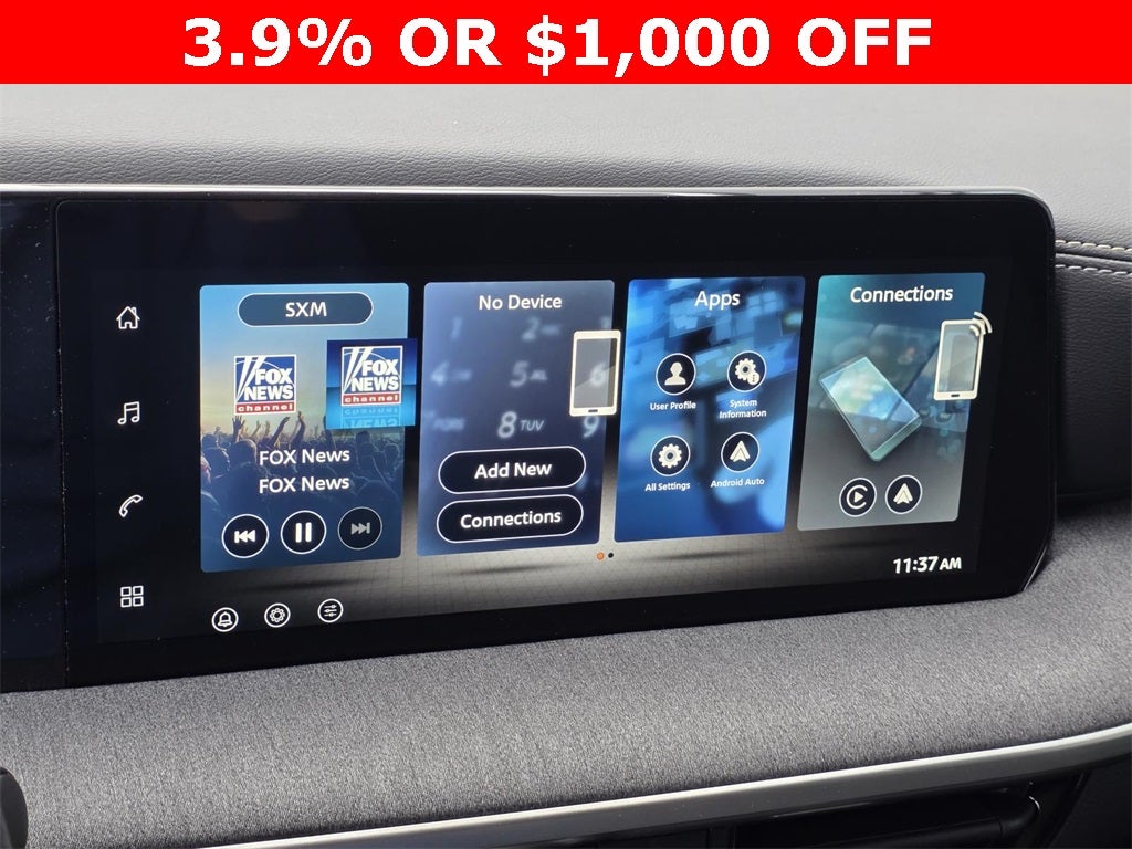 - Radio: AM/FM/SiriusXM Audio System -inc: 12.3" color touchscreen display w/4 speakers, Bluetooth® hands-free phone system, streaming audio via Bluetooth®, NissanConnect featuring wireless Apple CarPlay, wireless Android Auto, Siri eyes free and hands-free text messaging assistant, audio and Bluetooth® steering wheel switches