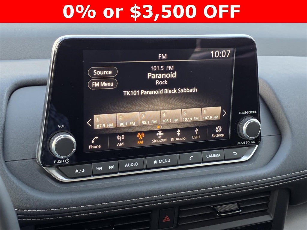 - Radio: AM/FM NissanConnect -inc: 6 speakers plus 2 tweeters, Apple CarPlay, Android Auto, 8" color touch screen display, Bluetooth®, 2 front USB type-C, Wi-Fi hotspot and NissanConnect Services powered by SiriusXM