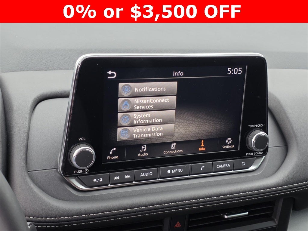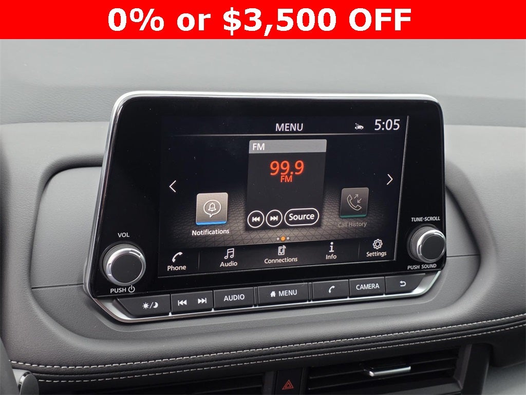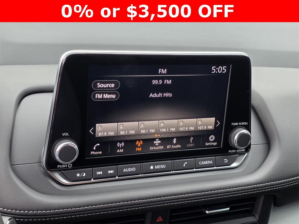 - Radio: AM/FM NissanConnect -inc: 6 speakers plus 2 tweeters, Apple CarPlay, Android Auto, 8" color touch screen display, Bluetooth®, 2 front USB type-C, Wi-Fi hotspot and NissanConnect Services powered by SiriusXM