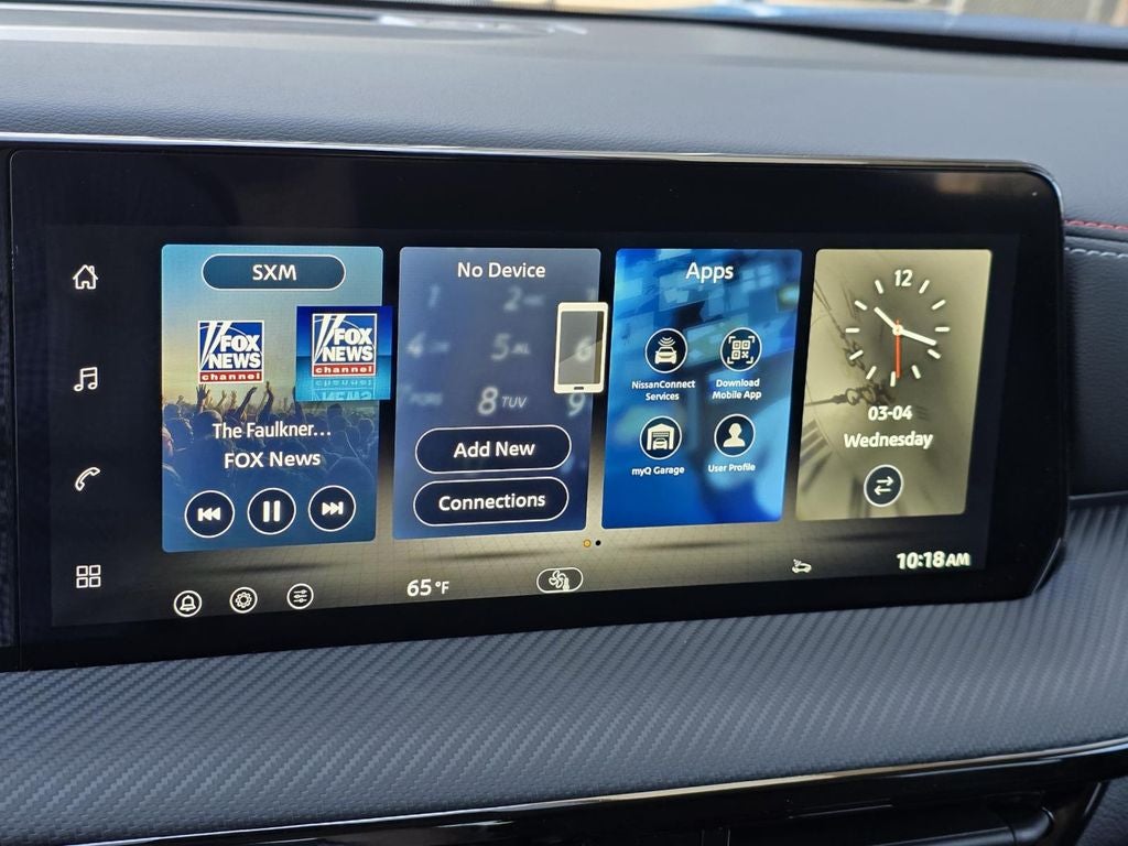- Radio: AM/FM/SiriusXM Audio System -inc: 12.3" color touchscreen display w/6 speakers, Bluetooth® hands-free phone system, streaming audio via Bluetooth®, NissanConnect Services powered by SiriusXM featuring wireless Apple CarPlay, wireless Android Auto, Siri eyes free and hands-free text messaging assistant, audio and Bluetooth® steering wheel switches and Wi-Fi hotspot